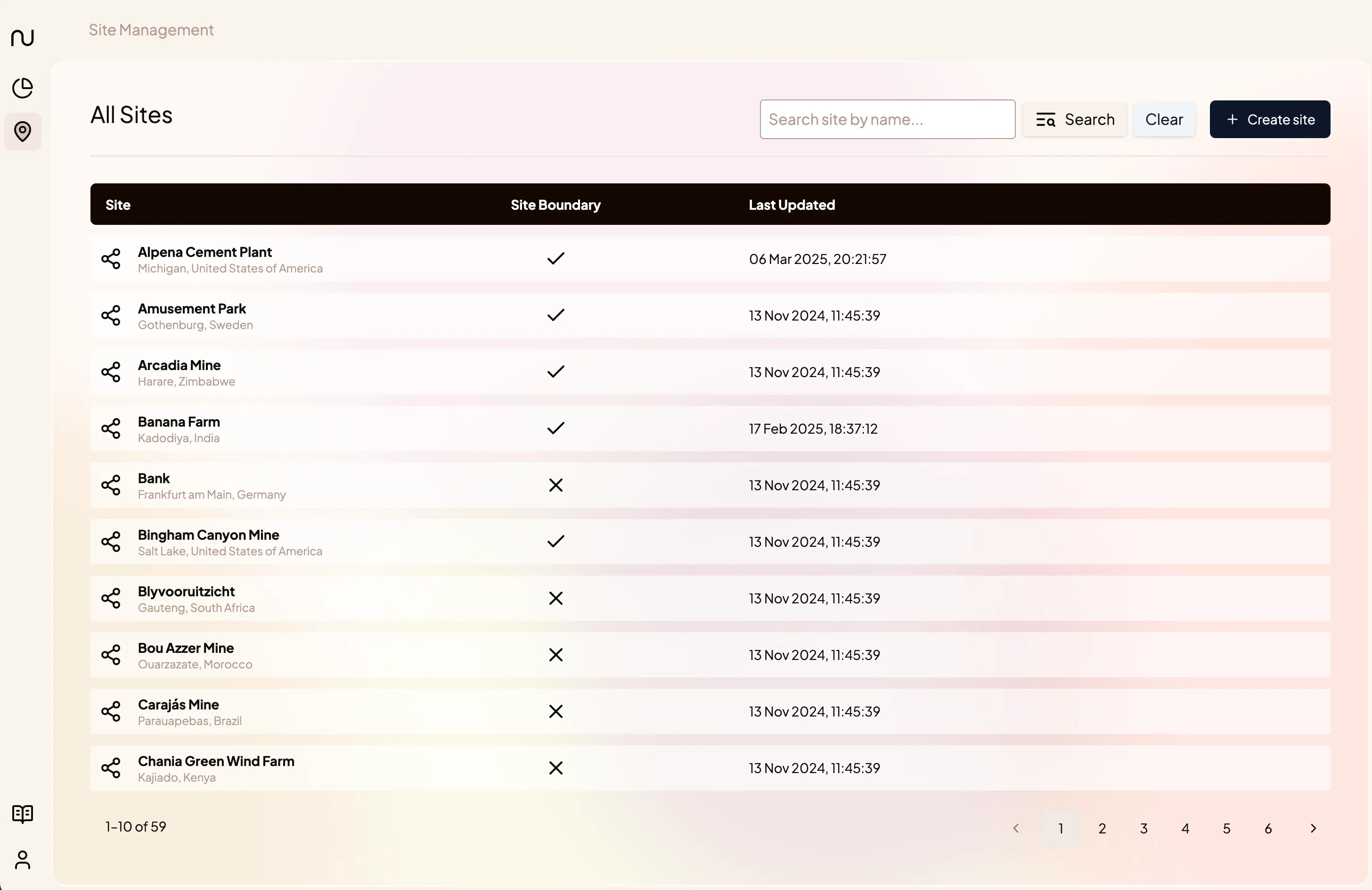 To add a single site, head to the Site Management module and click Create Site in the top right hand corner. Alternatively, click the + symbol in the left-hand navigation bar.